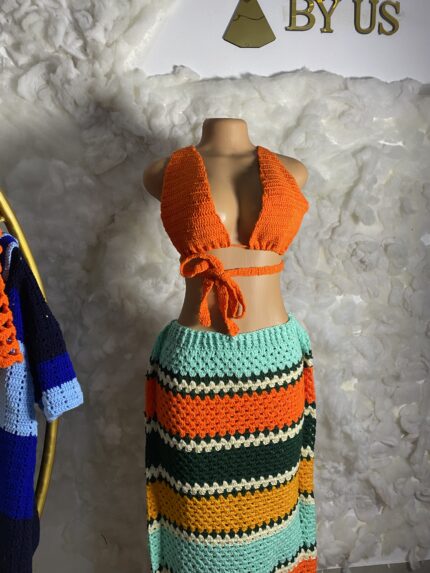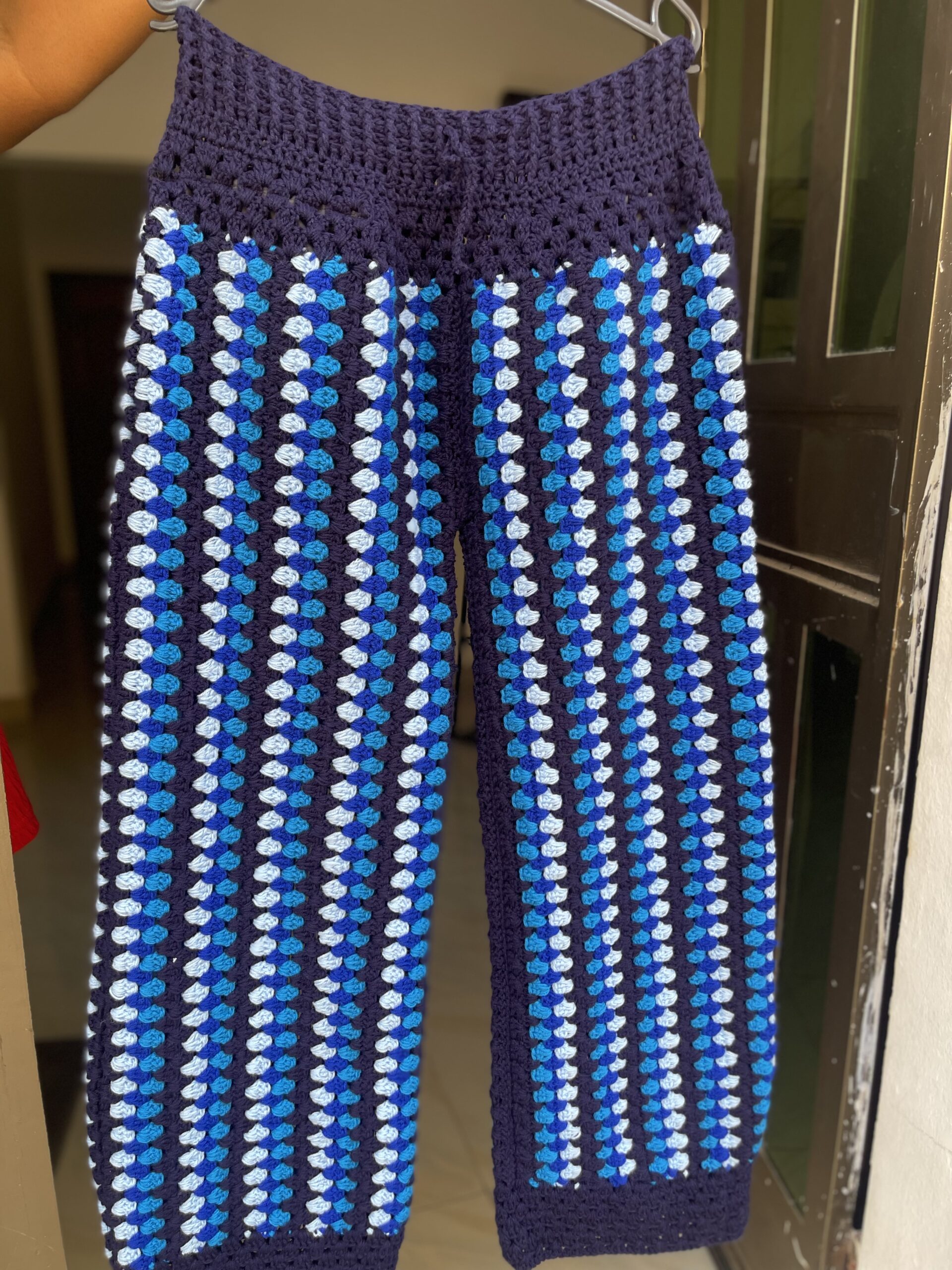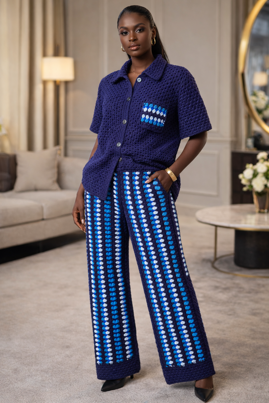 Découvrez cet ensemble en crochet fait main, une tenue artisanale élégante composée d’une chemise à manches courtes et d’un pantalon assorti. Réalisé avec soin, ce modèle associe un bleu marine profond à des motifs géométriques bleus et blancs, apportant un style à la fois moderne et raffiné.