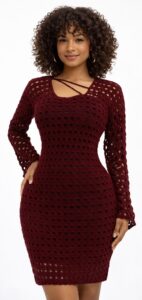 Élégante et intemporelle, cette robe bordeaux au crochet séduit par sa couleur profonde et son motif délicatement ajouré. Sa coupe raffinée met en valeur la silhouette avec une touche de sophistication. Une pièce unique faite main, parfaite pour un look chic et féminin.